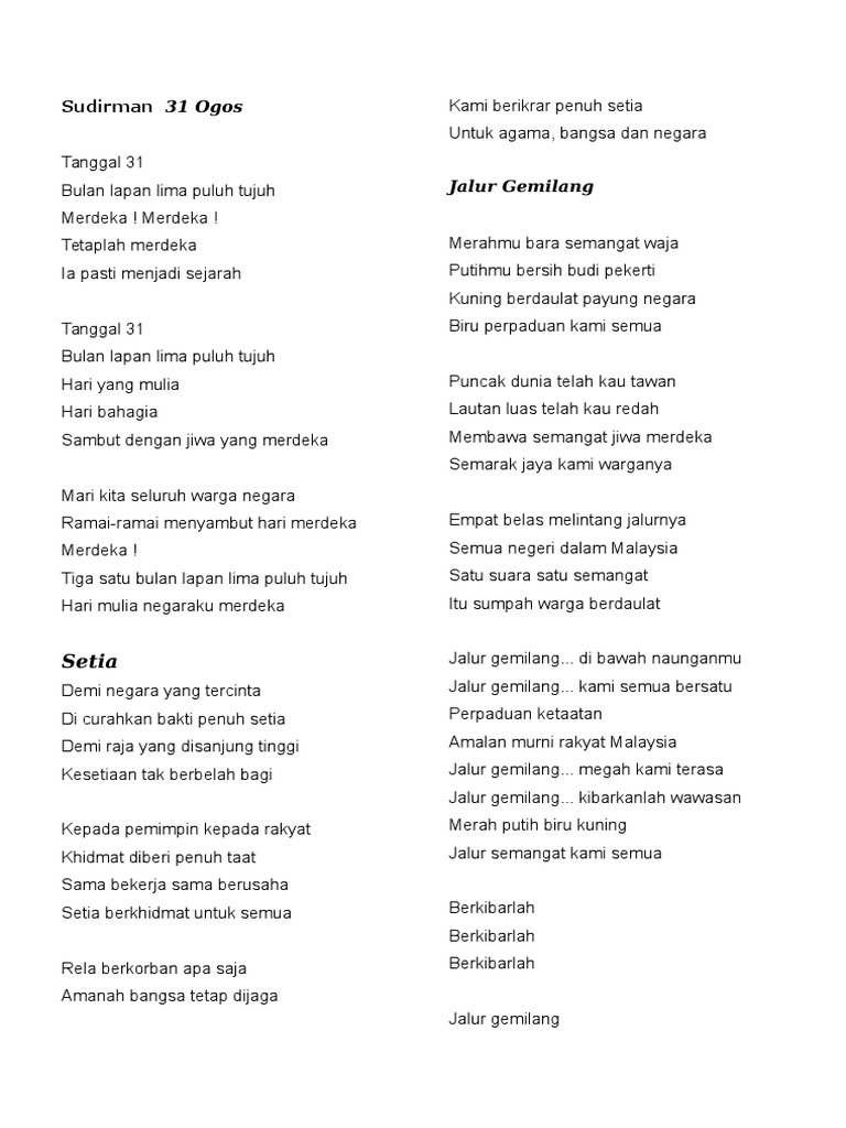 HIMPUNAN LIRIK LAGU PATRIOTIK SEMPENA HARI KEBANGSAAN MALAYSIA HARI MERDEKA Tarikh keramat 31 Ogos sememangnya satu tarikh yang cukup bermakna bagi. Malaysia oh tanah airku Tanah tempat tumpah darahku Negeri elok amat kucinta Yang kupuja sepanjang masa Sawahmu terbentang meluas Tumbuh-tumbuhan hijau merendang Bukitmu. Lagu saya anak malaysia with lyrics.